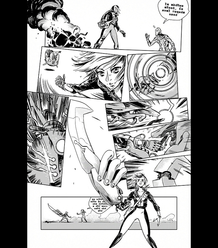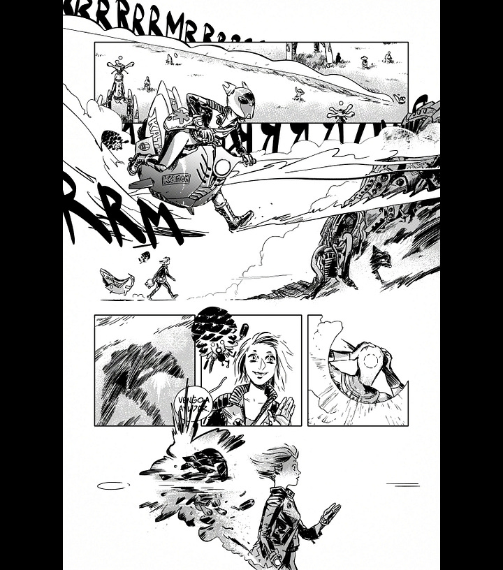Siempre me ha gustado utilizar las historias cortas para experimentar estilisticamente o formalmente. En este caso quería encontrar un estilo que me sirviera para un proyecto largo, y formalmente la idea era hacer algo un poco metacomic, donde la propia narración influye en la estructura de la página (tapa textos, mueve viñetas) y a su vez lo resultante influye en lo narrado (la de malentendidos que se podrían evitar si una explosión que todavía no ha ocurrido no tapara tu bocadillo de texto, no?)
